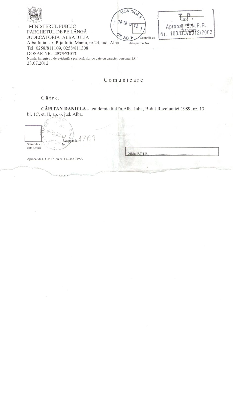 Daniela Capitan Ministerul Public Parchetul De Pe Lingă Judecătoria Alba Iulia Dosar Nr 457 P 2012 Rezoluție De Neincepere A Urmăririi Penale 28 Iulie 2012 Procuror Dodoacă Nicolae Din Cadrul Parchetului De Pe Lingă