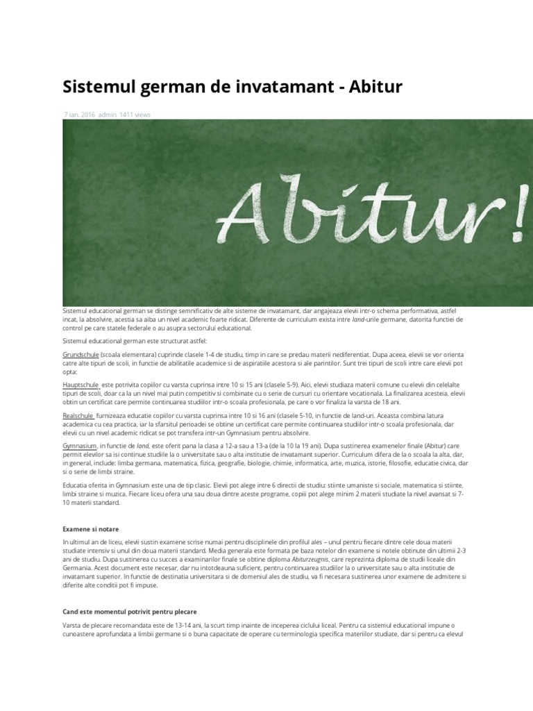Sistemul de invatamant german. Posts about sistemul de invatamant german written by consilierjuridicgermanoroman. Sistemul de invatamant german este format din invatamant general de la varsta de 3 la 6 ani copiii pot frecventa kindergärten invatamantul preprimar. Numele meu este raluca ancuta barbura locuiesc in nürnberg si sunt traducator public autorizat pentru limbile germana si romana astfel in baza legii privind autorizarea traducatorilor si translatorilor pentru landul bayern si a juramantului depus in fata judecatorului de pe langa tribunalul nürnberg. Sistemul de notare german cuprinde note de la 1 până la 6 în care nota 1 este nota cea mai mare.